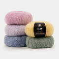 Strikket eller hæklet alene bliver Elba florlet, og med 2 eller flere tråde sammen bliver resultatet fyldigt og vamset. Den bløde Elba er også oplagt som følgetråd sammen med fx uld. Sammenlignet med silkemohair fælder Elba ikke, som den glatte mohairfiber kan gøre. Derfor kan Elba være et fantastisk alternativ til Super Kid Silk - og så er den mere prisvenlig.